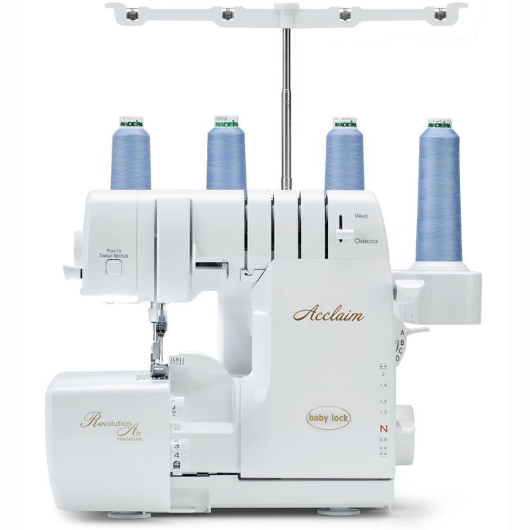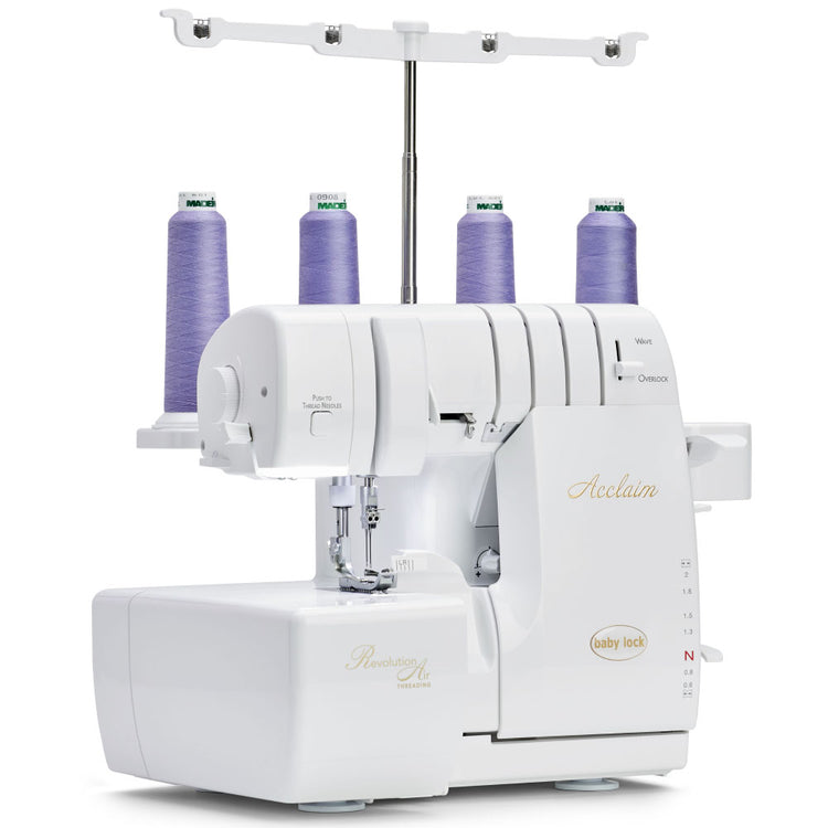 The Baby Lock Acclaim Serger makes serging painless while producing professional-looking results. Jam-packed with features like the coveted RevolutionAir™ Threading, Automatic Thread Delivery System (ADS), advanced knife driving, one-way clutch system, 4/3/2 thread serging, a wider workspace, full-featured single unit differential feed, fabric support system, vertical needle penetration, adjustable stitch length, automatic rolled hem, and more! Enrich your creative possibilities and produce impressive finished looks with the Baby Lock Acclaim Serger. Your serging will certainly be awarded a new degree of critical acclaim!