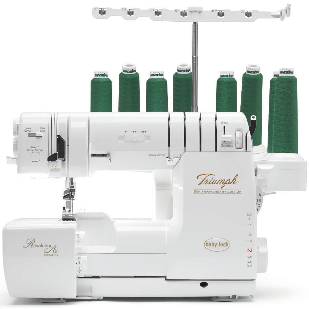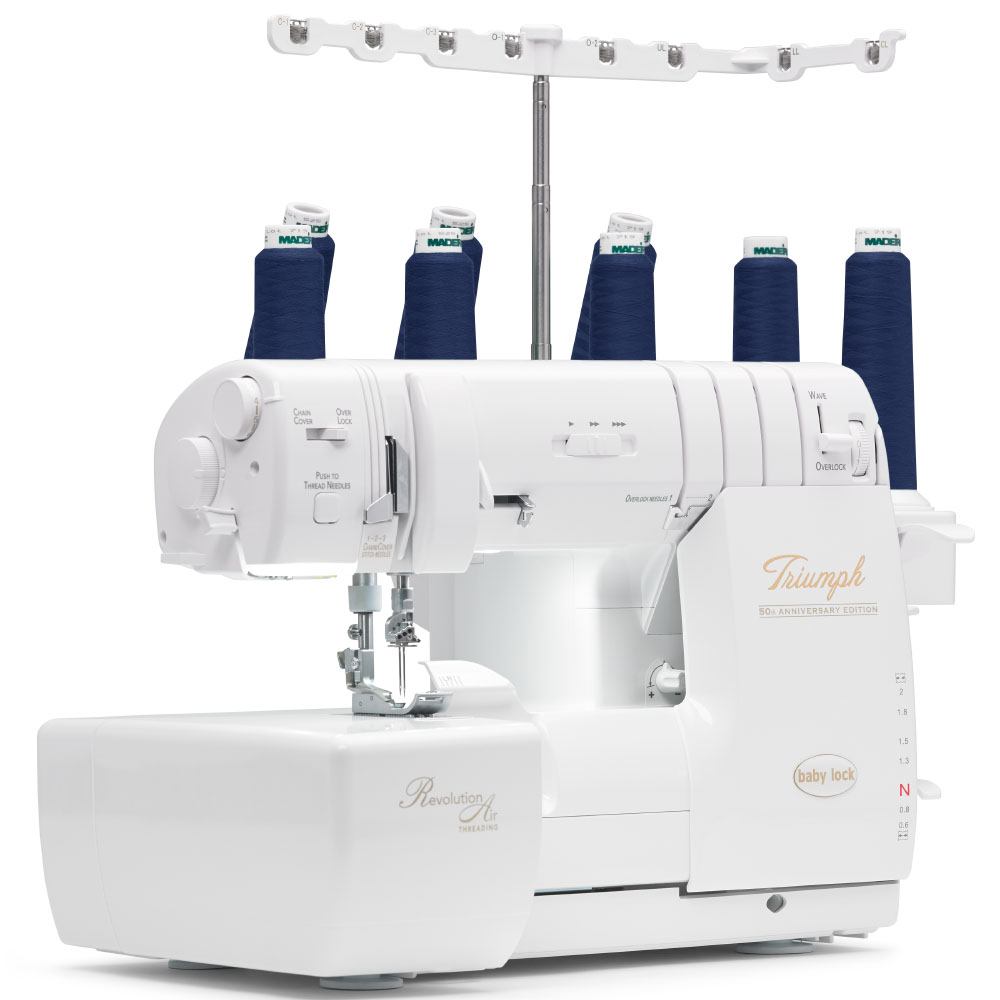 Baby Lock's BLETS8 Triumph Air Threading Serger will conquer the serging process in a way like never before. This 8-thread serger has RevolutionAir threading technology, which means you can now thread your loopers with just the touch of a button and then thread your needles automatically with the push of another button. The BLETS8 has one of the largest throat spaces you will find on any home serger, and the 5" of space on the Triumph is more than enough room for most projects. Baby Lock's Triumph Air Threading Serger is also equipped with Automatic Thread Delivery (ATD). With ATD, you get perfectly balanced stitches without ever having to adjust tension dials, and you can thread your loopers in any order. The ATD, when combined with the Looper Drive System, prevents loopers from becoming misaligned or out of time, thereby protecting your machine from damage. These features, combined with a snap-on presser foot, 87 stitch combinations, and 1500 stitches per minute, make the BLETS8 Triumph one of the most advanced sergers on the market.