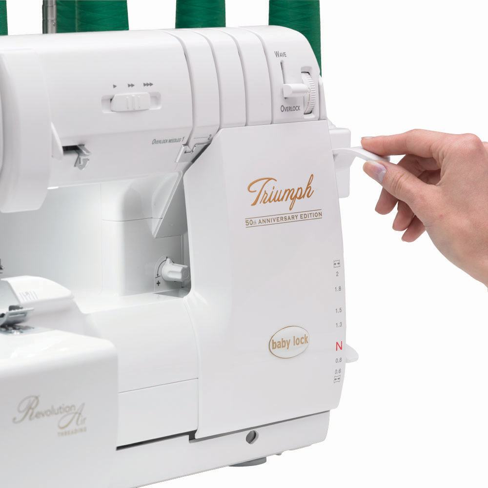 Don't worry about having to hunt down a screwdriver whenever you need to change presser feet! The Baby Lock Triumph comes equipped with a snap-on presser foot shank. Simply press the button on the back of the shank, and your current foot detaches instantly. Your new presser foot easily snaps back onto the shank so you can keep serging!