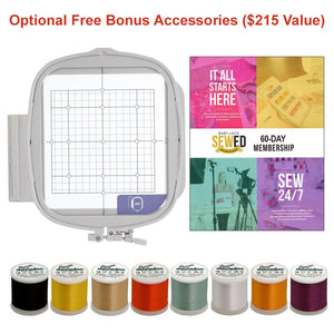 Receive 60 days of free access to Baby Lock's SewED Online classes, a genuine Babylock 6" x 6" embroidery hoop, and eight 1,100-yard spools of Madeira rayon 40-weight embroidery thread.