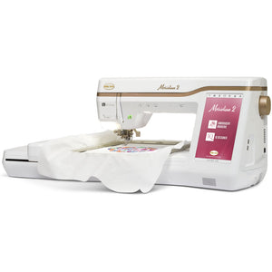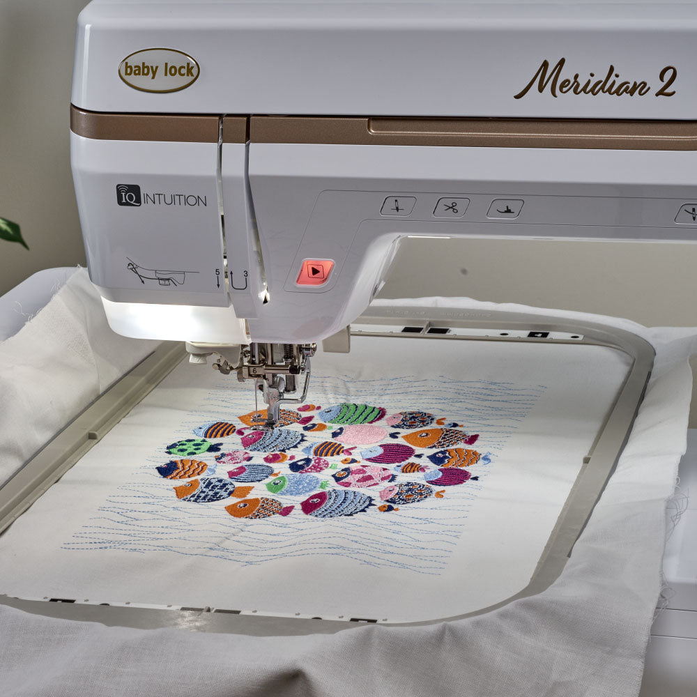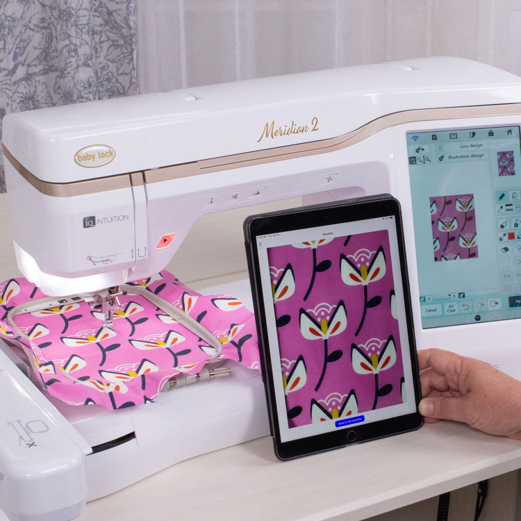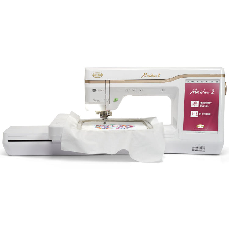 Showcase the inner artiste within yourself and get motivated to explore your creative potential with the Baby Lock Meridian 2 Embroidery Machine. Making embroidery easier than ever thanks to IQ Technology™! Wirelessly transfer images to your machine from your smart device using the IQ Intuition™ Positioning App for perfect design placement in the hoop or design creation in IQ™ Designer. Featuring a 9.5" by 14" embroidery field, a collection of 534 built-in embroidery designs, a 10.1" LCD screen, an 11.25" workspace to the right of the needle, NeverMiss™ automatic advanced needle threader, an LED needle beam, an automatic thread cutter, a quick-set top-loading bobbin and sensor, an independent bobbin winding system, and enhanced stadium lighting, the Baby Lock Meridian 2 Embroidery Machine is loaded with intuitive features and technology making it effortless to bring your daydream to life!