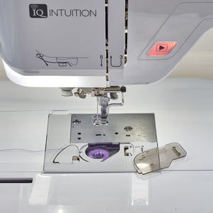 Touch Pen (Stylus), Embroidery Foot with LED Pointer, Embroidery Couching Foot and Guide, Spft Canvas Cover, Alternate Bobbin Case and Bobbin Center Pin for Prewound Bobbins, Embroidery Bobbin Thread, Bobbins (10), Embroidery Positioning Stickers (4 Sheets of 64), Lens Calibration Sheet for the IQ Intuition™ Positioning App, Needles, Spool Caps (5), Spool Felt and Spool Nets (2), Embroidery Needle Plate Cover, IQ Intuition™ Embroidery Hoops and Grids (9.5" by 14" & 5" by 7"), Power Cord, and Instruction Manual.