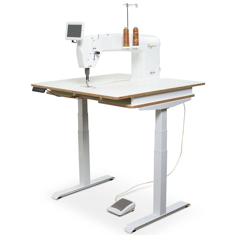 Choose from two table options for the Regalia ST. The Baby Lock Lift Table is 38" x 38" with an adjustable table height from 23" to 49" that will allow you to easily sit or stand while quilting. The Baby Lock Standard Table is 36" x 38" and has a fixed height that is meant to be used while sitting.