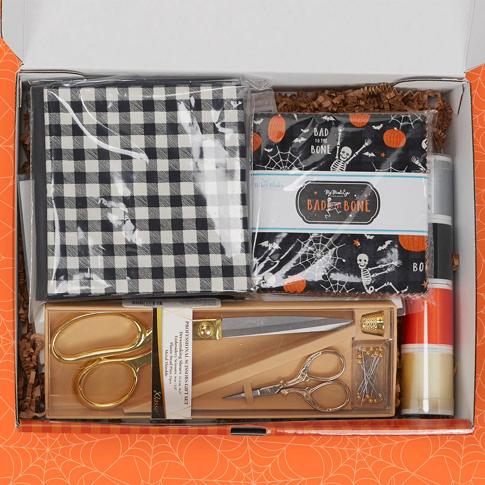 The Baby Lock & Riley Blake Halloween Décor Project Kit is a fun little project with almost everything you need to make a small quilt. This set includes the Going a Little Batty Pattern, a four-spool Maderia thread kit, fabric from the Bad to the Bone Collection, and a Klasse scissors set. The decor kit is ideal for beginner to advanced sewists.
