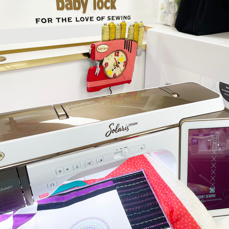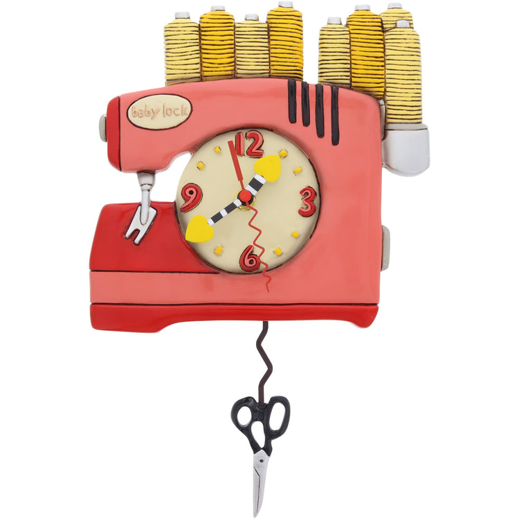 Never lose track of time while sewing with this Baby Lock Serger Clock. This analog clock is the perfect decorative item for your sewing room; it even makes a great gift. Designed by Michelle Allen in partnership with Baby Lock, this clock features a whimsical take on a serger with its rounded design and fun colors. It even has a cute scissor pendulum. The clock takes one AA battery (not included), and when the pendulum stops swinging, this is your sign that it's time to change the battery.