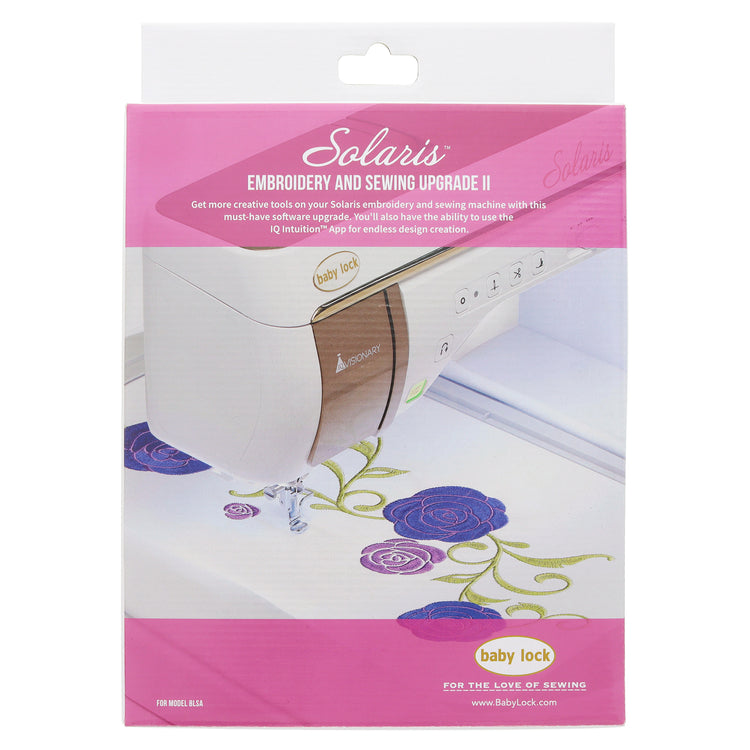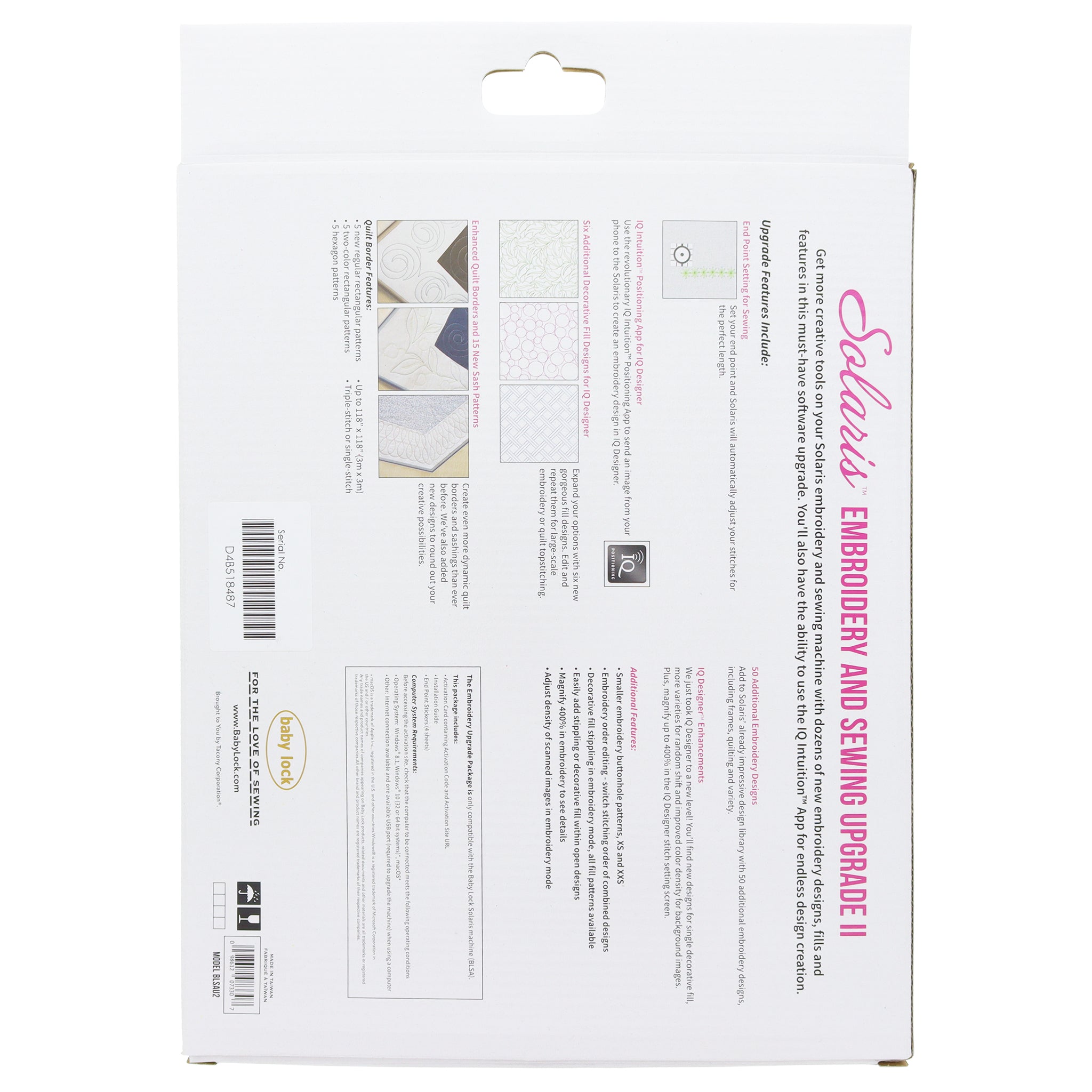The Baby Lock Solaris Embroidery and Sewing Upgrade 2 (BLSAU2) elevates your sewing and embroidery experience by adding innovative features to the Solaris series. You'll enjoy more decorative fills, new quilt sash patterns, and 50 new embroidery designs. It introduces the IQ Intuition™ Monitoring App, which lets you track your progress remotely, making it easier than ever to manage projects with precision.