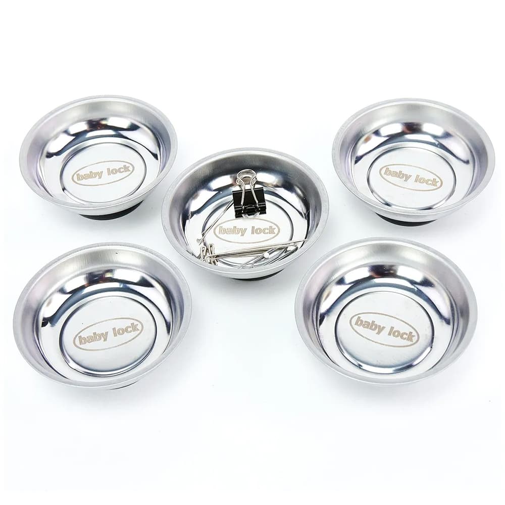 Stop misplacing pins and other metallic notions with the help of Babylock Magnetic Accessory Bowl. This magnetic pincushion has a 3" diameter with a 1-5/8" magnet on the bottom that helps secure small metal notions. Engraved on the inside of the bowl is Babylock's infamous logo. This magnetic dish is a handy companion to help keep your sewing area clean of loose pins.