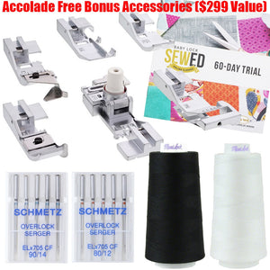 When purchasing your Baby Lock Accolade, receive our free exclusive bonus accessory bundle. The bundle includes a 60 day free trial to Baby Lock's SewED Online classes, a six piece presser foot kit, 2 spools of Maxi Lock Serger Thread, and 2 packs of Organ chrome finish needles.