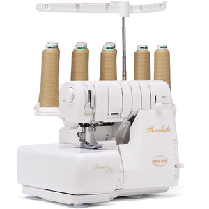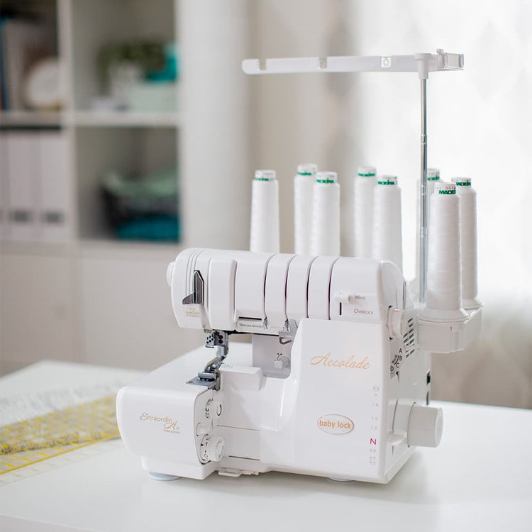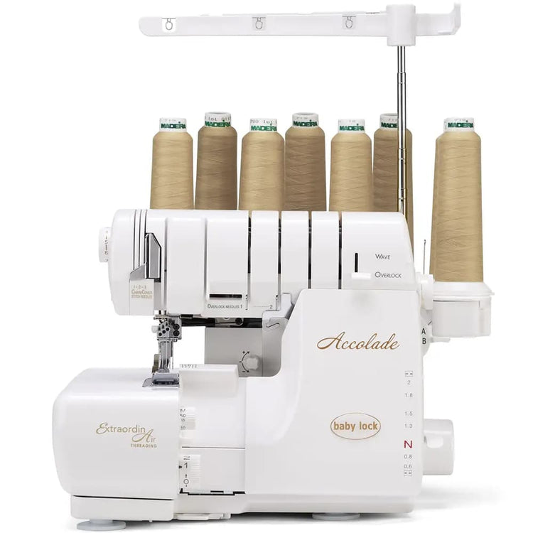 The sky is the limit with Babylock's Accolade Serger. This 8-thread serger brings a new creative element that's missing on other standard sergers. With eight-thread combinations, you have 87 stitch options to choose from, so you will never run out of ways to finish your edges. The Accolade features ExtraordinAir®, tubular loopers, 8/7/6 thread stitch capacity, an automatic thread delivery system, and so much more. This dynamic machine will serge up to 1500 stitches per minute, allowing you to finish projects faster. With no tension adjustments required, bright LEDs, and a full differential feed, you will get professional results every time. Your Baby Lock Accolade is a high-quality, dependable machine that gives you the ability to seam, overcast, and trim all in one operation. Fabrics and threads you previously avoided are now a joy to sew because the Baby Lock Accolade handles all varieties with equal ease. The Accolade has all the features you've come to expect from Baby Lock sergers that make all your creative dreams a reality.