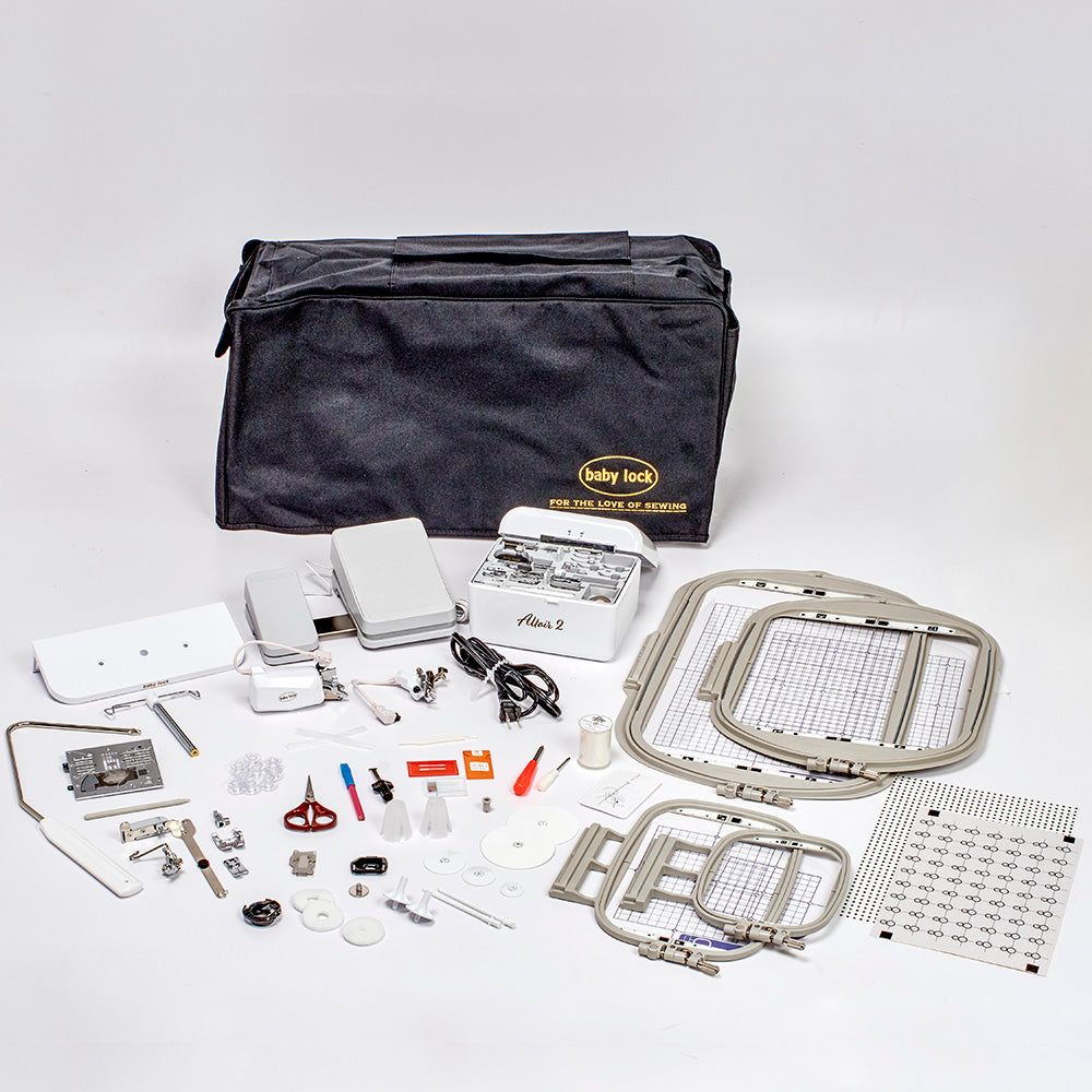 The Get Started Kit lets you hit the ground running with your new machine. The Altair 2 Get Started Kit includes Baby Lock's Welcome Home Exclusive Embroidery Design Collection, the new 7"x12" magnetic frame, an XL quilted trolley, a 26-piece foot kit, 60-days of online sewing classes, a $15 coupon code to Embroidery Library, and a $15 coupon code to Urban Threads.