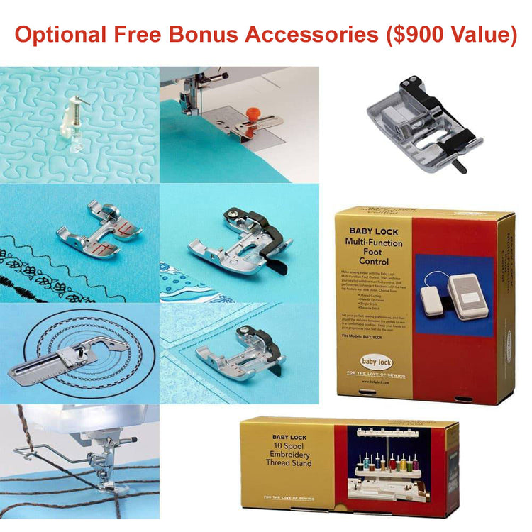 Free Motion Quilting Foot, Circular Sewing Attachment, Open Toe Sole For Digital Dual Feed Foot, Stitch In The Ditch Sole for Digital Dual-Feed Foot, 1/4" Sole with Guide for Digital Dual Feed Foot, Edge Joining Foot, Seam Guide, Free-Motion Couching Foot, Multifunction Foot Control, a 10 Spool Embroidery Thread Stand, and 60-days of Baby Lock SewEd Classes.