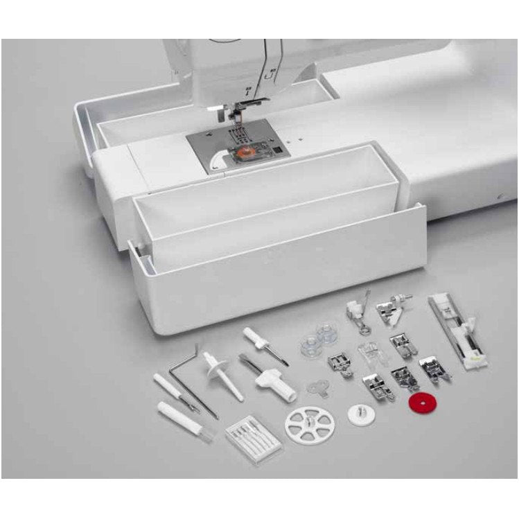 Additional Included Accessories: Buttonhole Foot, Overcasting Foot, Darning/Free Motion Foot, Blind Hem Foot, Quilting Guide, Vertical Spool Pin, Bobbins, Needle Set, Twin Needle