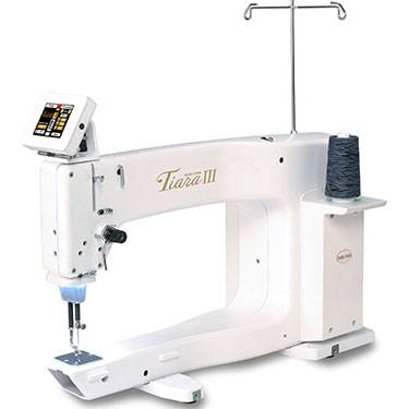As the first home sewing company to bring you longarm quilting, Baby Lock is proud to introduce the Tiara III. Home quilters interested in finishing projects with polish will love the compact Tiara III quilting machine. This smooth operating machine sews up to 1,800 stitches per minute and comes with its own table so you can be ready to quilt right away. The included new quick-set tension allows you to easily adjust upper thread tension and view your settings on the digital LCD readout. With a workspace measuring 16 inches to the right of the needle by 8.25 inches high, the Tiara III has more space than the average sewing machine. Even so, it is a compact sit-down machine that's ideal for your first step into the world of longarm quilting.