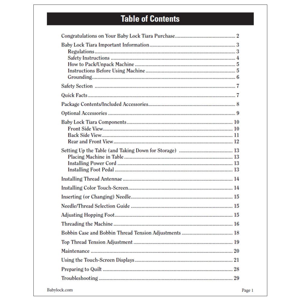 Babylock BLTR16 Tiara Sewing Machine Instruction Manual (Model BLTR16) - 33 Pages. Lost your sewing machine's manual? We've got you covered! This instruction manual is the ultimate guide to unlock the full potential of your Baby Lock BLTR16 Tiara. No more confusion or frustration—just clear, concise instructions right at your fingertips. What's inside? Everything you need to know from setting up to mastering your sewing machine and all its features.