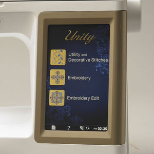LCD Color Touch Screen: The LCD touch screen shows 260,000 colors, measures 7" diagonally, and shows the date/time, presser foot, stitch preview, stitch selections, pattern display size, estimated embroidery time, stitch count, and more. You can also edit your designs on the touch screen. Combine embroidery designs, rotating patterns, mirror imaging, change colors, and shrinking or enlarging designs are just some of the editing capabilities of the Baby Lock Unity.