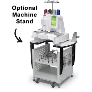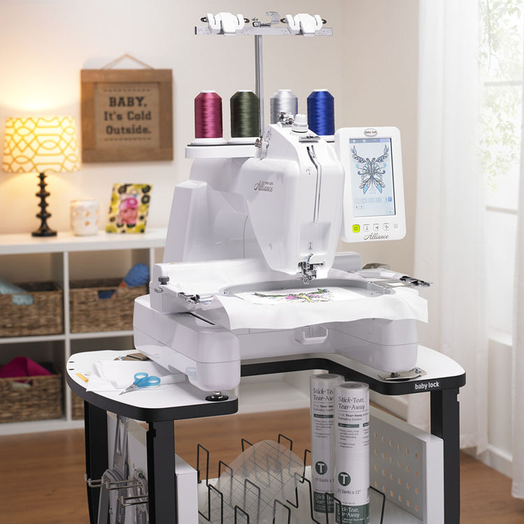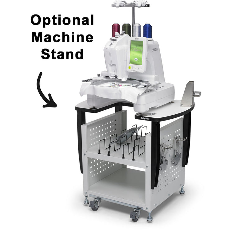 You won't regret purchasing the optional embroidery machine stand along with your Baby Lock Alliance. This stand is on locking casters, so you can easily move it around your sewing room. It comes with 2 storage shelves and 4 adjustable brackets so you can hang your hoops or accessories.