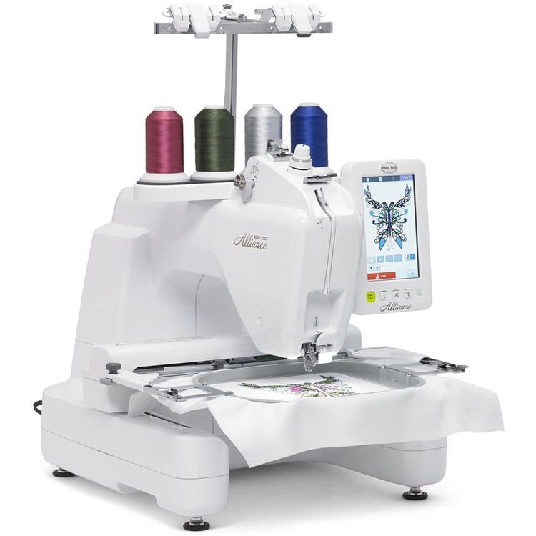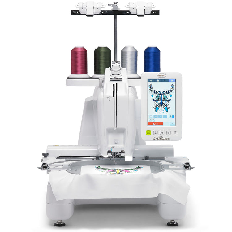 Babylock's Alliance is a single-needle embroidery machine that will allow you to expand your creative horizon. The machine lets you nurture your creativity with 4-spool staging, 125 built-in designs, and 25 fonts from which to choose. The exceptional stitch-reading capacity makes this machine stand out from the crowd. Babylock's Alliance comes with all you will need to get started immediately. Multiple hoops, prewound bobbins, and a multitude of other useful items come safely packed in a handy, easy-to-store accessories case. The narrow free arm and single-needle operation make the Alliance suitable for embroidering in small spaces. Baby clothes, face masks, and pet apparel become a breeze with the skinny free arm. You can also stitch on three-dimensional projects, opening up a world of possibilities. A slender arm, coupled with unique small hoops and frames, gives you the ability to embroider things you never thought possible before — any sewable material you can think of, from plush animals to shoes!