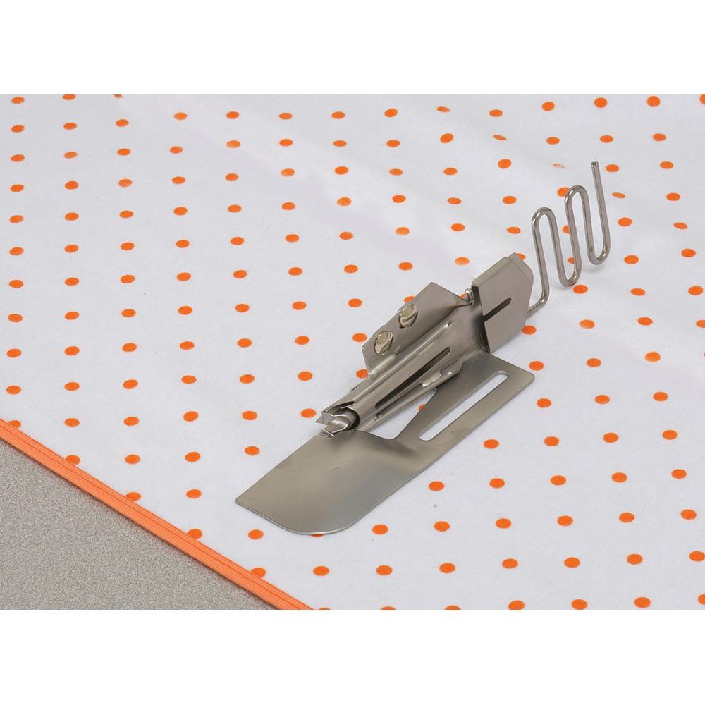 This double fold bias binder will turn fabric strips into binding and attach it to project edges all in one step. This attachment is perfect for curved edges, collars, and necklines on knit or woven fabrics.