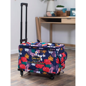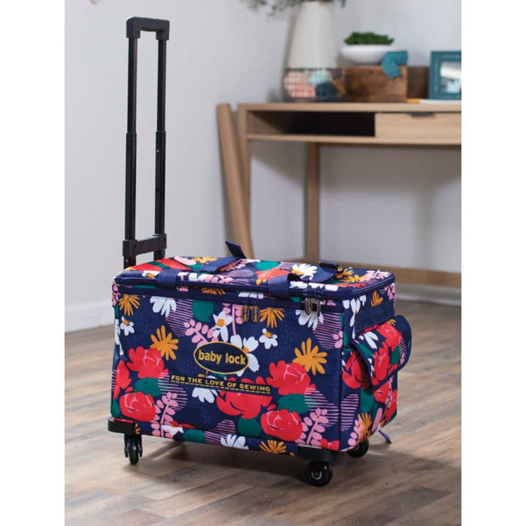 Safely transport your Baby Lock sewing machine in this durable, large Floral Machine Trolley Bag to class and on the road. Adjust the handle to a comfortable height and pull the easy-rolling trolley wherever you go. Made with reinforced padding and 600 Denier Polyester fabric. This bag is not intended for air travel. Trolley Dimensions: 19-1/2" L x 12" W x 12-1/2" D