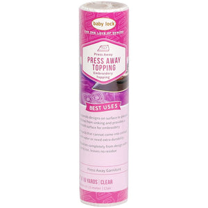Press-Away Topping is a temporary stabilizer that dissolves when pressed with a hot, dry iron. It's used during the application process to provide stitch stability, which helps prevent puckering, tunneling, and distortion. Press-Away Topping is perfect for applications that need strength but absolutely no stabilizer remaining.