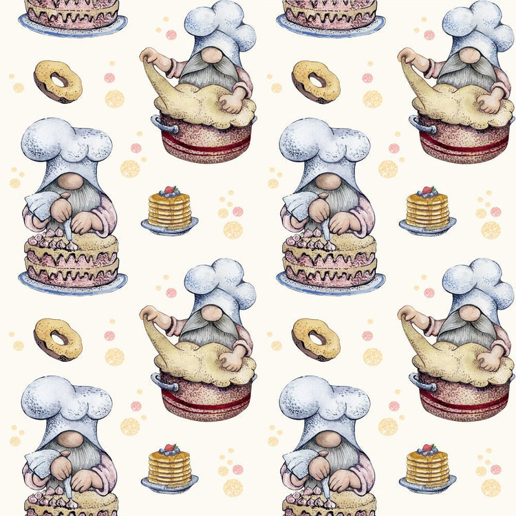The Baker Gnomes & Bubbles 2 Fabric is part of the Baker Gnomes Fabric Collection printed by Sew Creative Fabrics. Digitally Printed on 100% cotton.