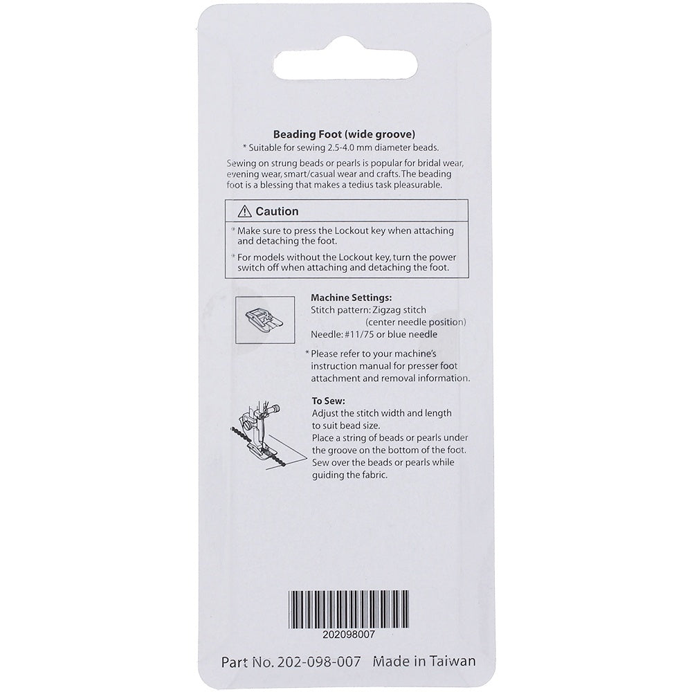 Sewing on strung beads and pearls has always been a tedious task, but the beading foot now goes some small way to Alleviating this and adding pleasure to embellishing. Popular for bridal wear, evening wear, smart/casual, or crafts, the beading footset is a blessing. There are two feet in the set for 9mm: narrow groove and wide groove.