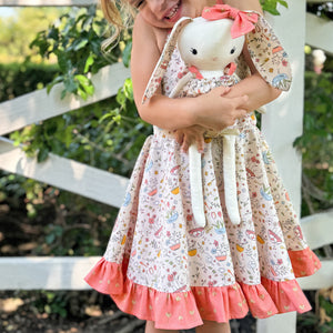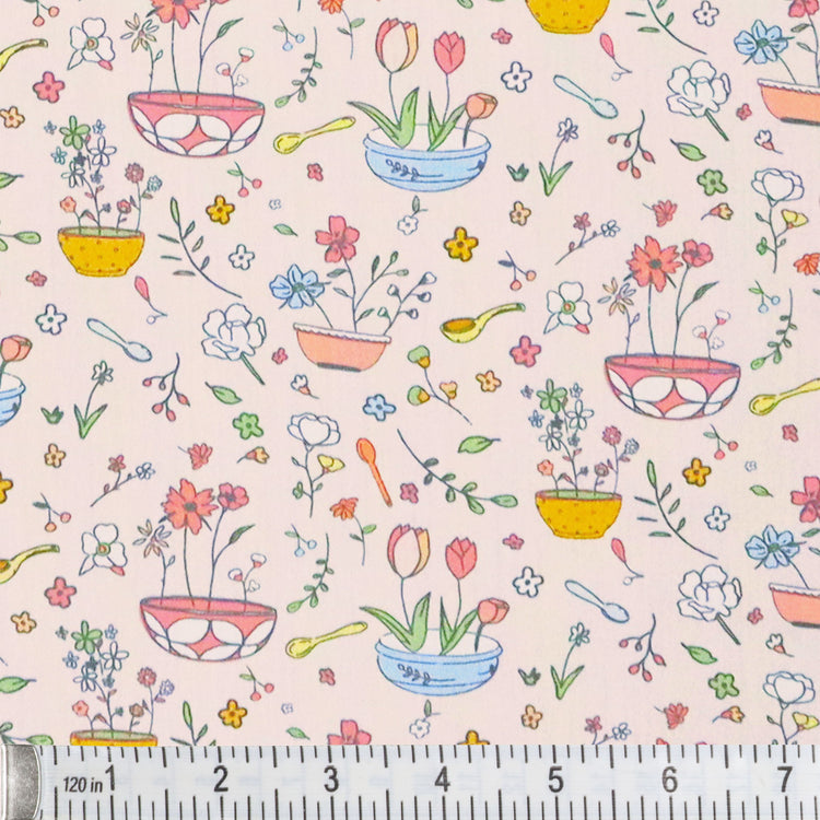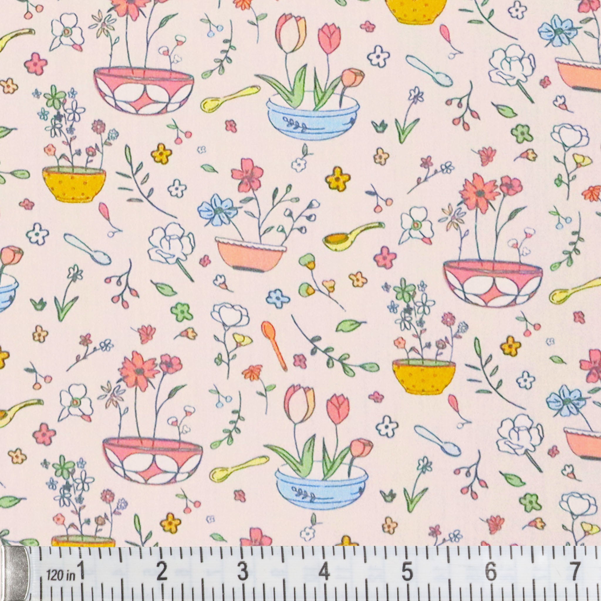 Charming and delightfully detailed, Perfect Spoonful captures the joy of a springtime tea party in the garden. Tiny teacups overflow with blooming flowers, surrounded by fluttering butterflies, floating leaves, and whimsical spoons—all sketched in a playful palette of pink, yellow, blue, and green on a warm cream background. This print feels like a page from a favorite childhood book, bringing lightness and imagination to dresses, dolls, quilts, and home décor. Whether you're sewing something sweet for a little one or adding a nostalgic accent to your next project, this print serves up just the right mix of fun and floral.