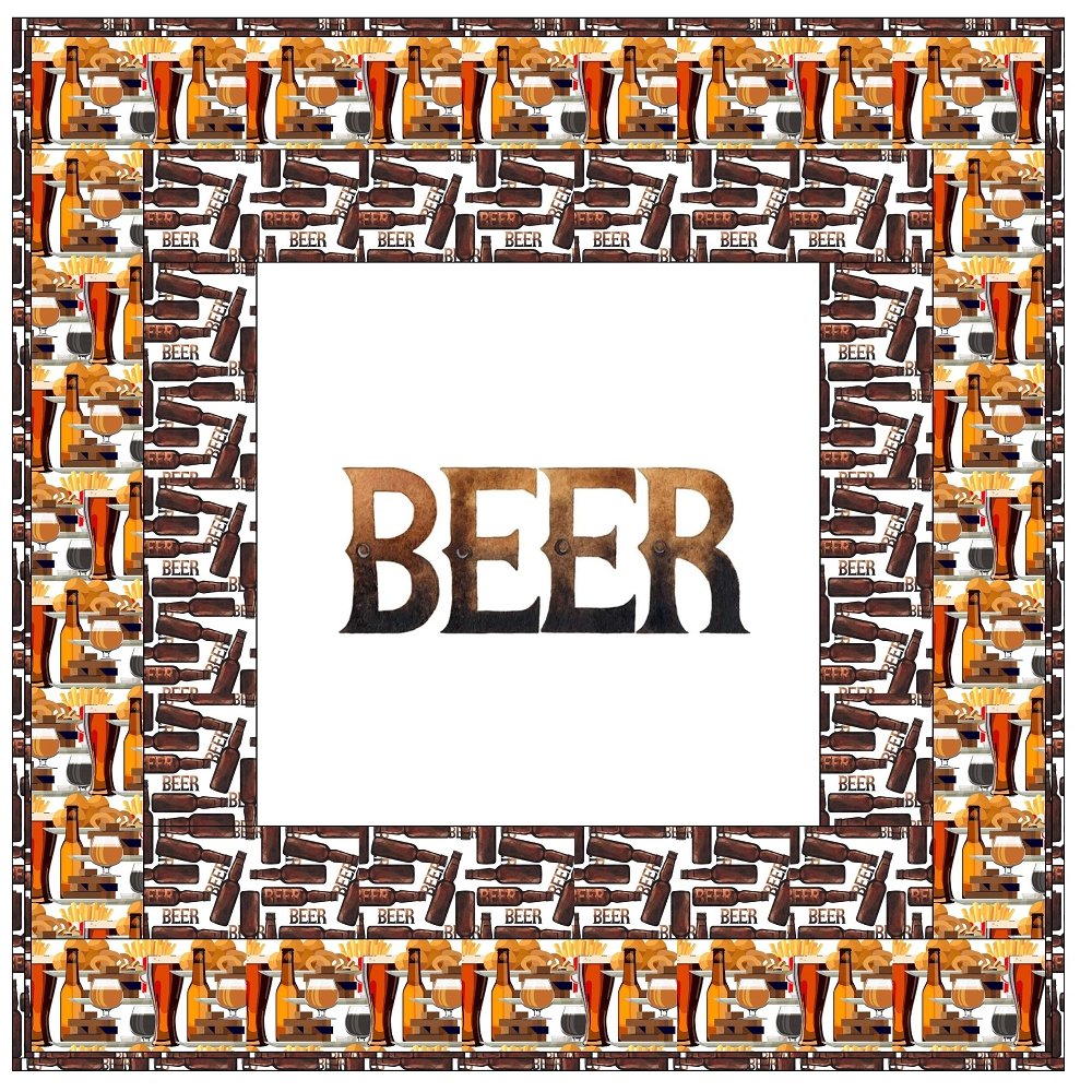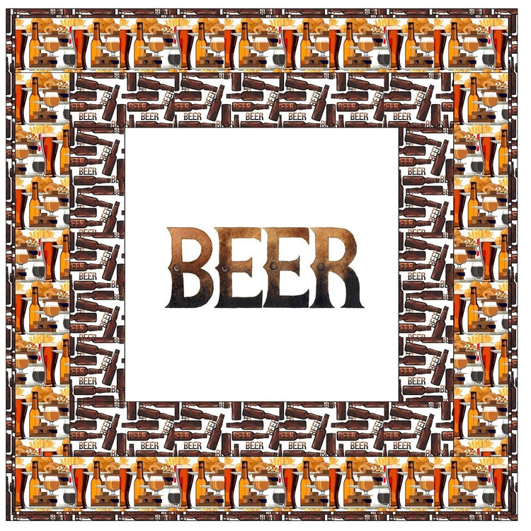 The Beer and More Beer Wall Hanging includes everything that you need to make the quilt - the instructions and a total of 3 1/2 yards of fabric and a 23" panel. It has two borders and is finished with a flange binding. Batting is sold separately. The finished size of this quilt is 42" x 42".
