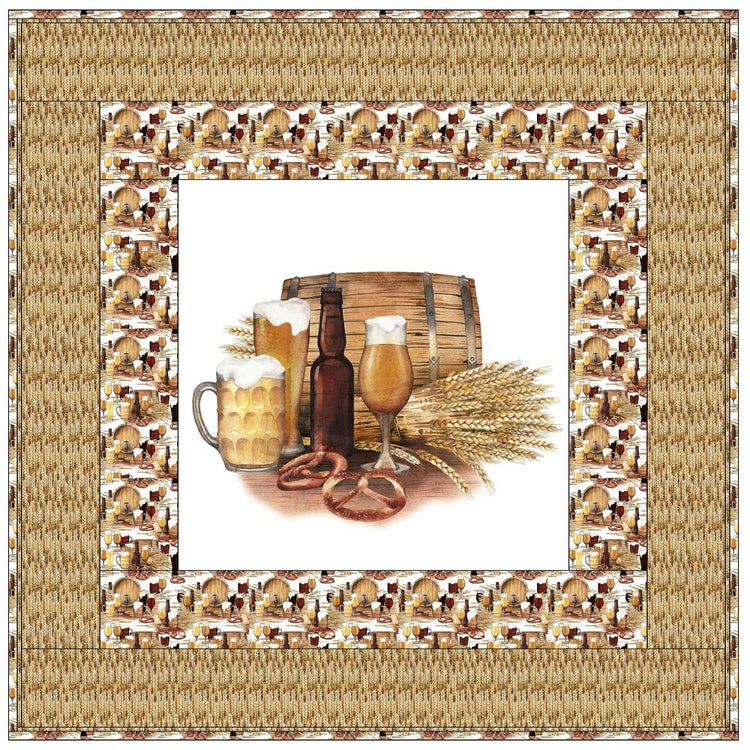 The Beer and Pretzels Wall Hanging includes everything that you need to make the quilt - the instructions and a total of 3 1/2 yards of fabric and a 23" panel. It has two borders and is finished with a flange binding. Batting is sold separately. The finished size of this quilt is 42" x 42".