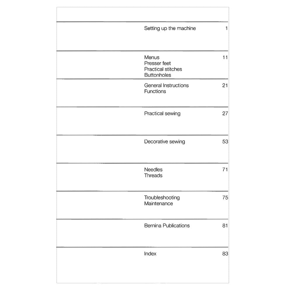 Bernina 1630 Sewing Machine Instruction Manual (Model 1630) - 113 Pages. Lost your sewing machine's manual? We've got you covered! This instruction manual is the ultimate guide to unlock the full potential of your Bernina 1630. No more confusion or frustration—just clear, concise instructions right at your fingertips. What's inside? Everything you need to know from setting up to mastering your sewing machine and all its features.