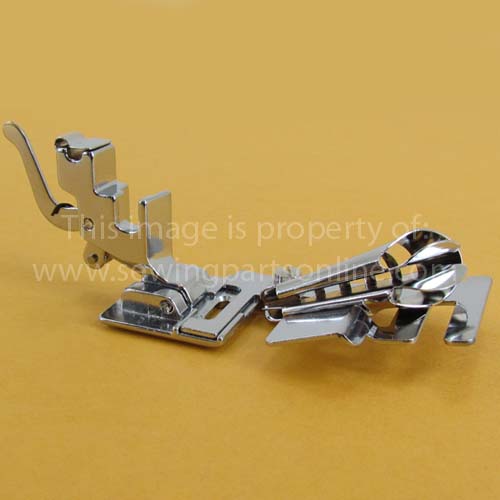 The binder foot is used to apply pre-folded bias binding tape or bias tape you have cut yourself to the edge of fabric in one easy step. It is equipped with a small funnel to fold and guide the binding over the fabric edge before it reaches the needle and can be used with either zigzag or decorative stitches as well as straight stitch.