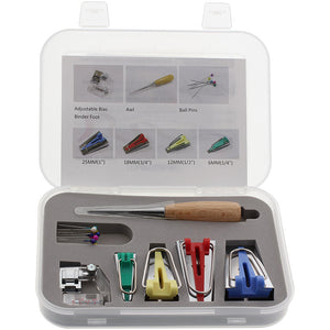 This Bias Tape Maker Set has everything you need to get started making your own bias tape. The kit includes four bias tape makers, an awl, approximately ten pins, and a snap-on adjustable bias binder foot. You get a 1" (25mm), 3/4" (18mm), 1/2" (12mm), and a 1/4" (6mm) bias tape maker in the kit. With all these tools at your disposal, you can finish any project with various types of fabric. To use the bias tape makers, insert a fabric strip and pull through the end to make even, consistent bias tape.