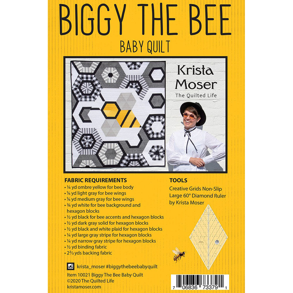 Biggy The Bee Baby Quilt is a playful and fun pattern! Biggie the Bee has a big personality for a little quilt. The Creative Grids 60-degree Diamond Ruler is required for this pattern and simplifies this quilt. Gain confidence in piecing with angles and fabric collection with no Y seams. This pattern is made with large, uncomplicated pieces to let your fabric steal the show. Finished size: 42" x 48"