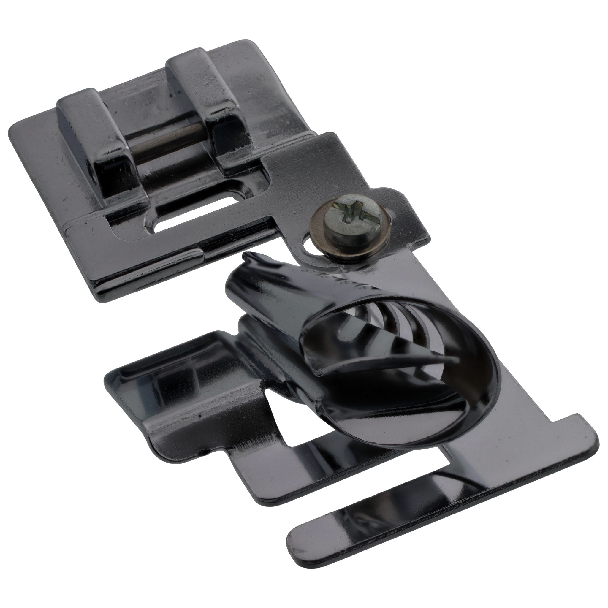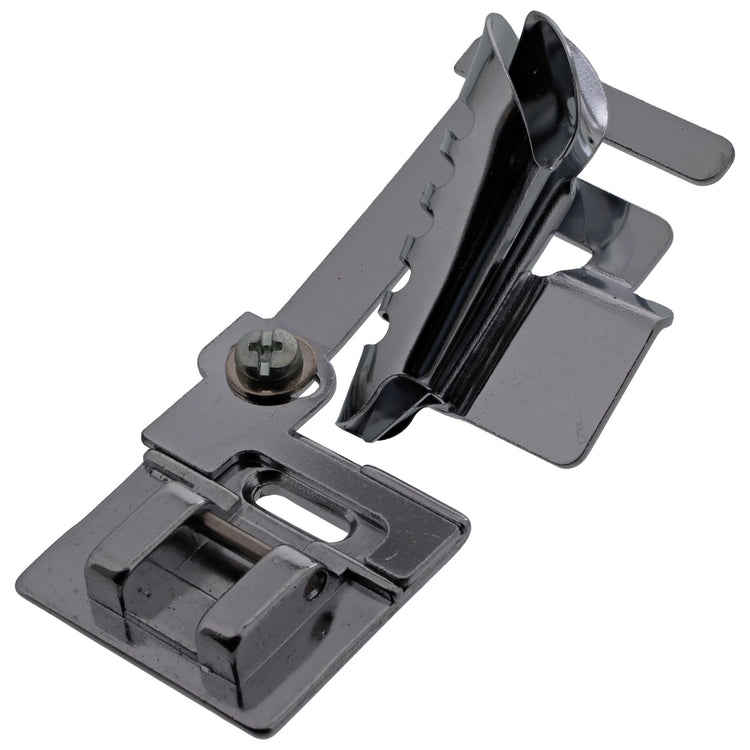 This Binder Foot is an easy way to add bias tape, trim, and finish an edge. It is also an excellent construction method for reversible garments. Use it to create frog closures, button loops, and ties. The spiral cone on this foot wraps the bias tape around the fabric edge.