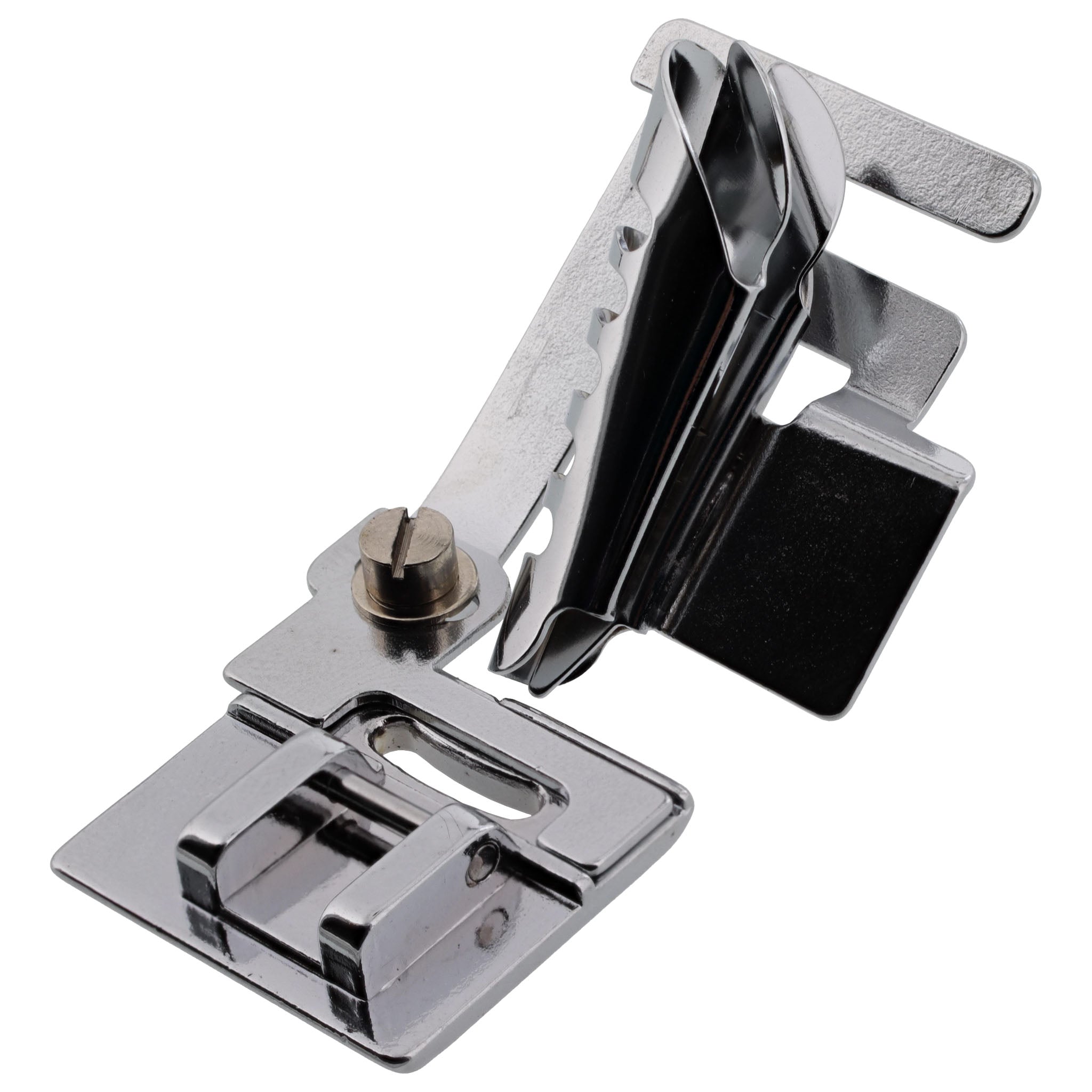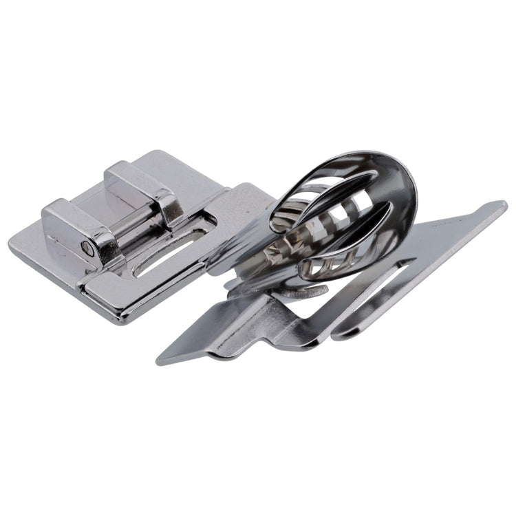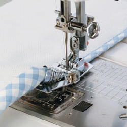 The Binder Foot is ideal for efficiently finishing a project by adding bias. It can also be used for reversible garments, edge finishing, or creating loops and ties. The spiral cone on the top of the foot wraps the pre-pleated bias tape around the edge of the sewn fabric.