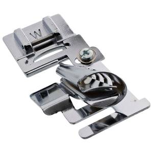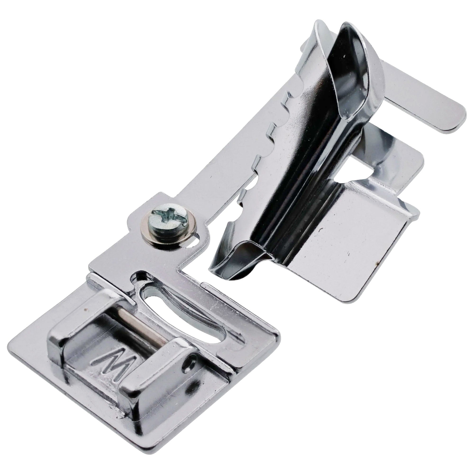 The Binder Foot is ideal for quickly finishing a creation by adding bias. It benefits reversible garments, edge finishing, or creating loops or ties. The Binder Foot has a spiral cone that wraps the pre-pleated bias tape foot around the edge of the sewn fabric—a folded bias of 1.5 cm.