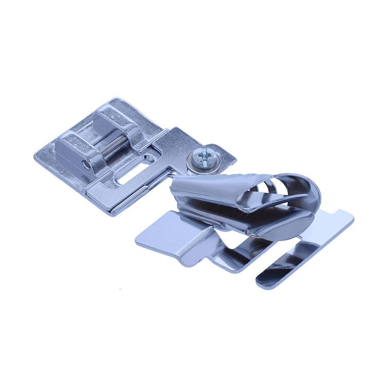 The binder foot is used to apply pre-folded bias binding tape or bias tape you have cut yourself to the edge of fabric in one easy step. It is equipped with a small funnel to fold and guide the binding over the fabric edge before it reaches the needle and can be used with either zigzag or decorative stitches as well as straight stitch.
