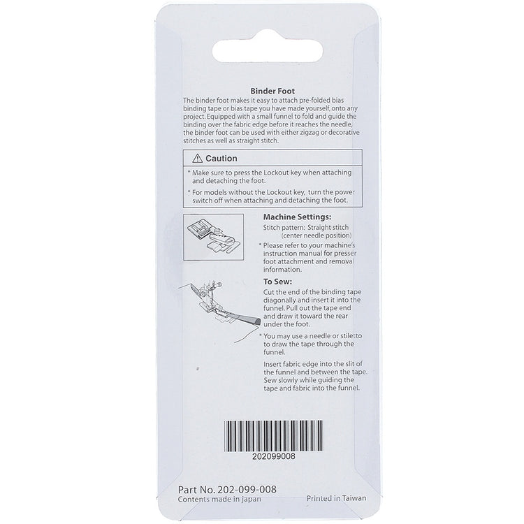 The binder foot is used to apply pre-folded bias binding tape or bias tape you have cut yourself to the edge of the fabric in one easy step. It is equipped with a small funnel to fold and guide the binding over the fabric edge before it reaches the needle and can be used with either zigzag or decorative stitches, as well as straight stitches,