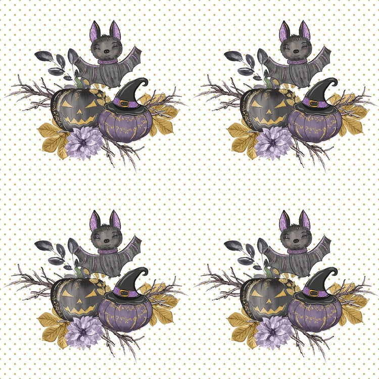 The White Black Pumpkins Bouquet Gold Dots Fabric is part of Black Pumpkins Fabric Collection printed by Sew Creative Fabrics. Digitally Printed on 100% cotton.