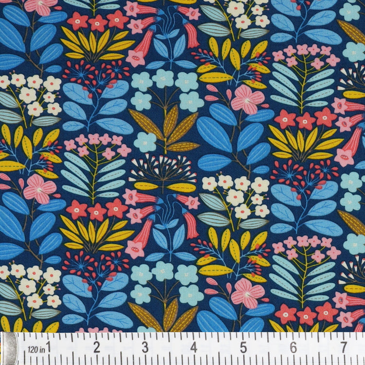 Striking and sophisticated, Emme Blue introduces a dramatic twist to the Blooming Color 2 palette. Saturated navy and cobalt florals intertwine with pastel pink, white, and mustard accents, all layered over a deep royal blue background. This colorway balances vibrant hues with clean structure, offering a dynamic yet grounded look. Crafted from 100% cotton and measuring approximately 44" wide, Emme Blue is ideal for modern quilting, statement bags, or eye-catching pillows.