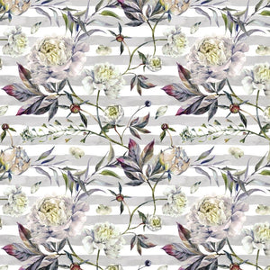 The Gray Blooming Peonies On Stripes Fabric is part of the Peony Symphony Fabric Collection printed by Sew Creative Fabrics. Digitally Printed on 100% cotton.