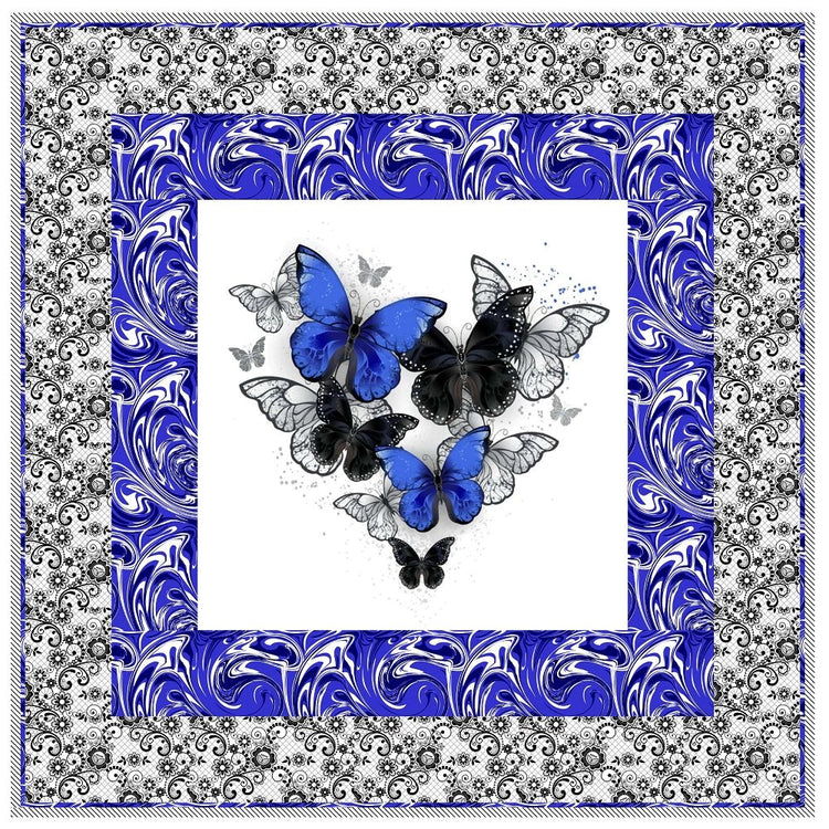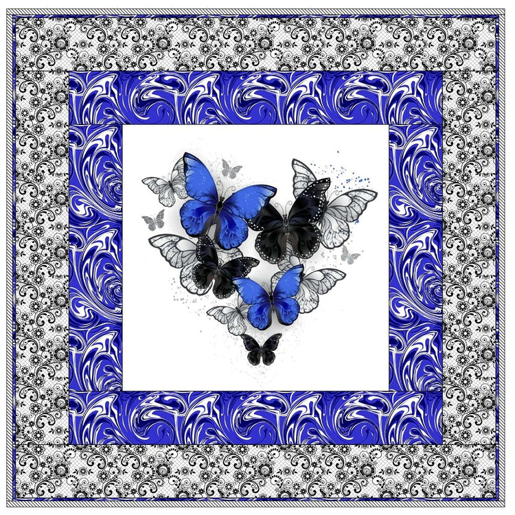 The Blue Butterflies Meadow Wall Hanging includes everything that you need to make the quilt - the instructions and a total of 3 1/2 yards of fabric and a 23" panel. It has two borders and is finished with a flange binding. Batting is sold separately. The finished size of this quilt is 42" x 42".