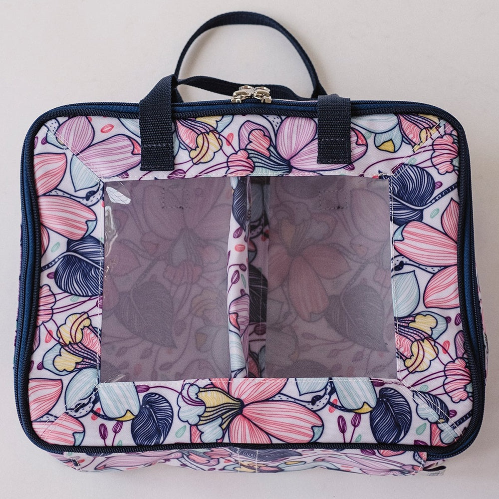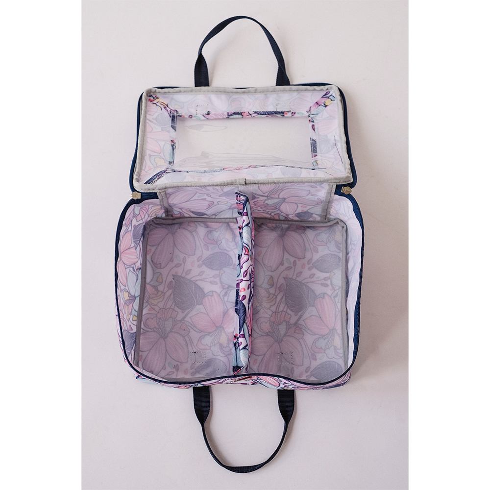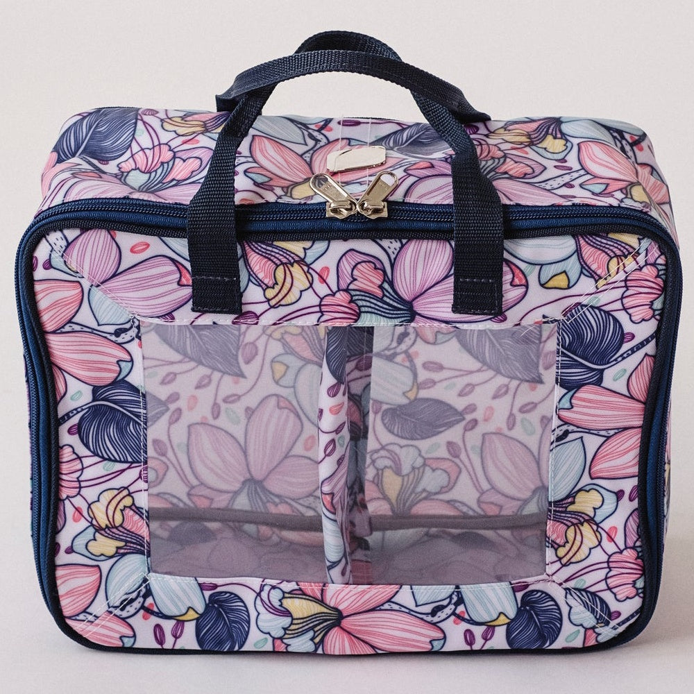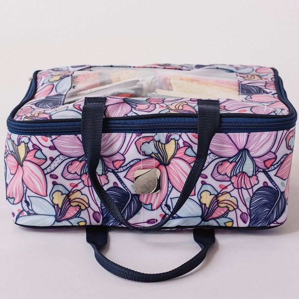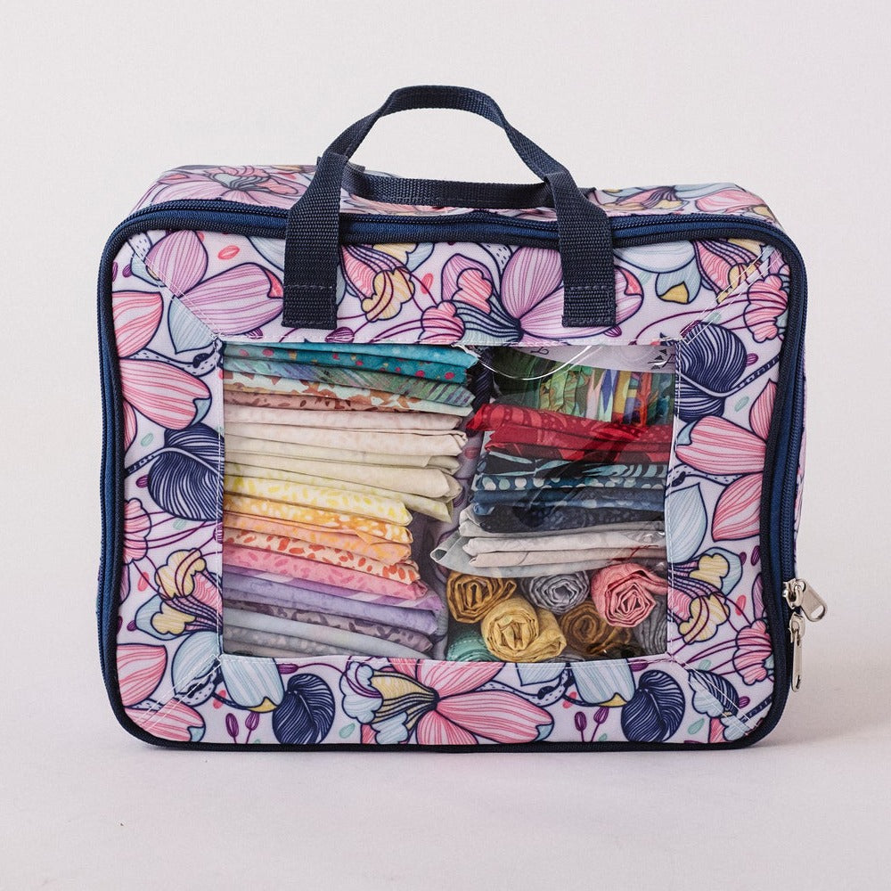 BlueFig's Maisy Fat Quarter Bag combines organization with style in a handbag you can carry to class or around town! Made of an easy-to-clean poly-canvas fabric, the bag has a clear vinyl window so you can see everything. It also has a removable divider so you can convert the bag to hold patterns, books, and more! The Fat Quarter Bag measures 13" wide by 10" tall and 5" deep. Please note the fabric pictured is not included.