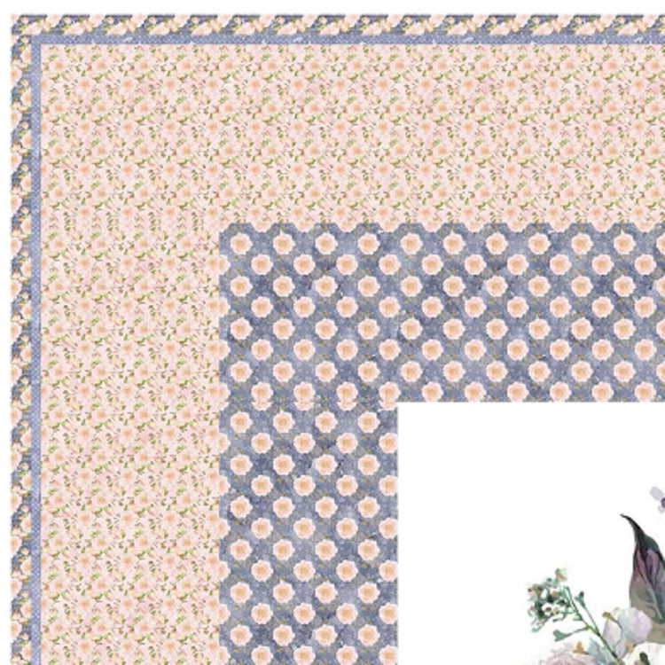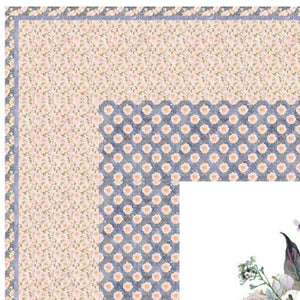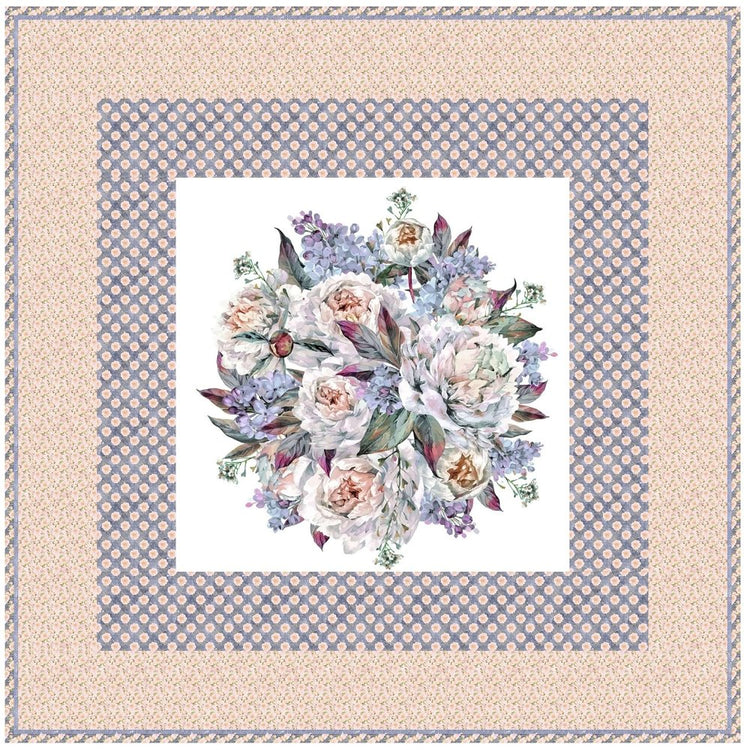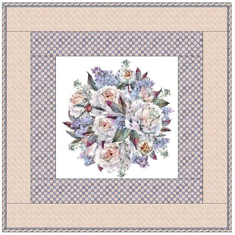 The Blushing Round Peonies Bouquet Wall Hanging includes everything that you need to make the quilt - the instructions and a total of 3 1/2 yards of fabric and a 23" panel. It has two borders and is finished with a flange binding. Batting is sold separately. The finished size of this quilt is 42" x 42".