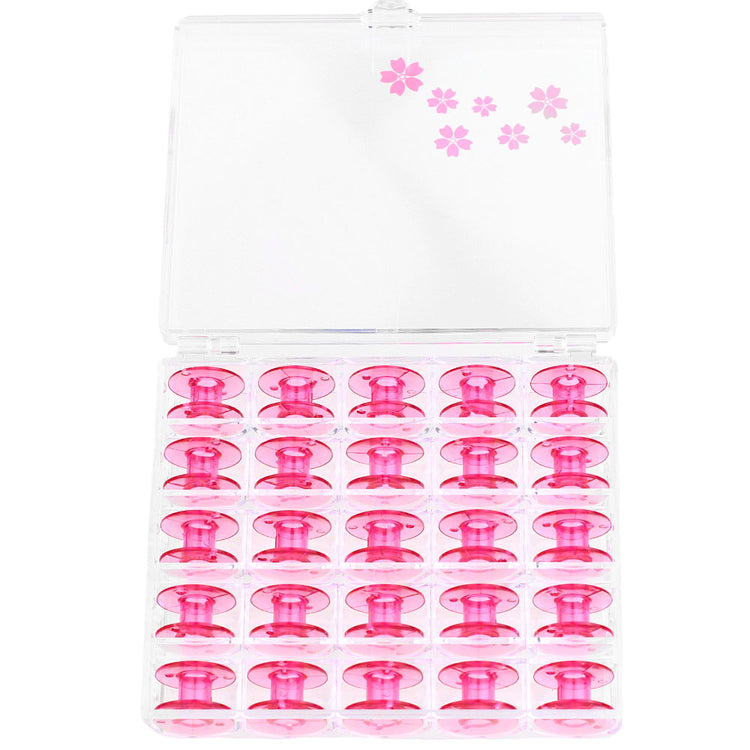 Janome cherry blossom colored bobbins: a special pink version of the Janome "J" bobbin. This set of 25 pink bobbins is packaged in cherry blossom motif organizer for easy carrying and storage.