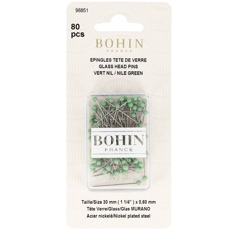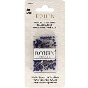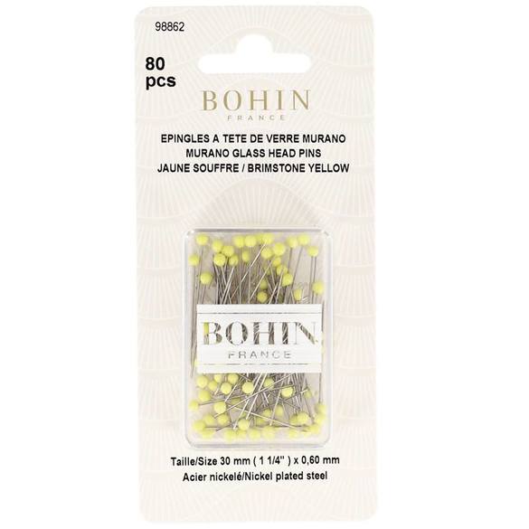 Bohin's Extra Fine Murano Glass Head Pins are so thin they leave virtually no mark on your fabric, even delicate materials. They are made from piano wire and have a Murano Glass head that will not melt when ironing. Each needle features a brightly colored head so you can quickly locate them when you are ready to remove them from your fabric. These Extra Fine Murano Glass Head Pins come 80 to a pack and measure 1-1/4" long. Choose from 15 colors: baby pink, brimstone yellow, brown, cobalt blue, coral, dark blue, dark pink, ivory, mustard, Nile green, pea green, pearl grey, purple, sky blue, and teal blue.