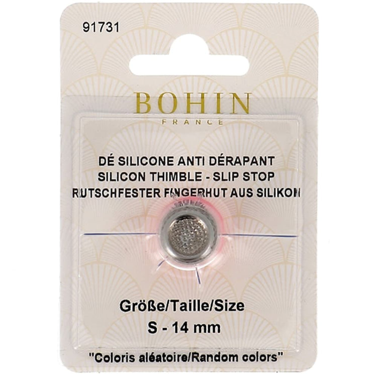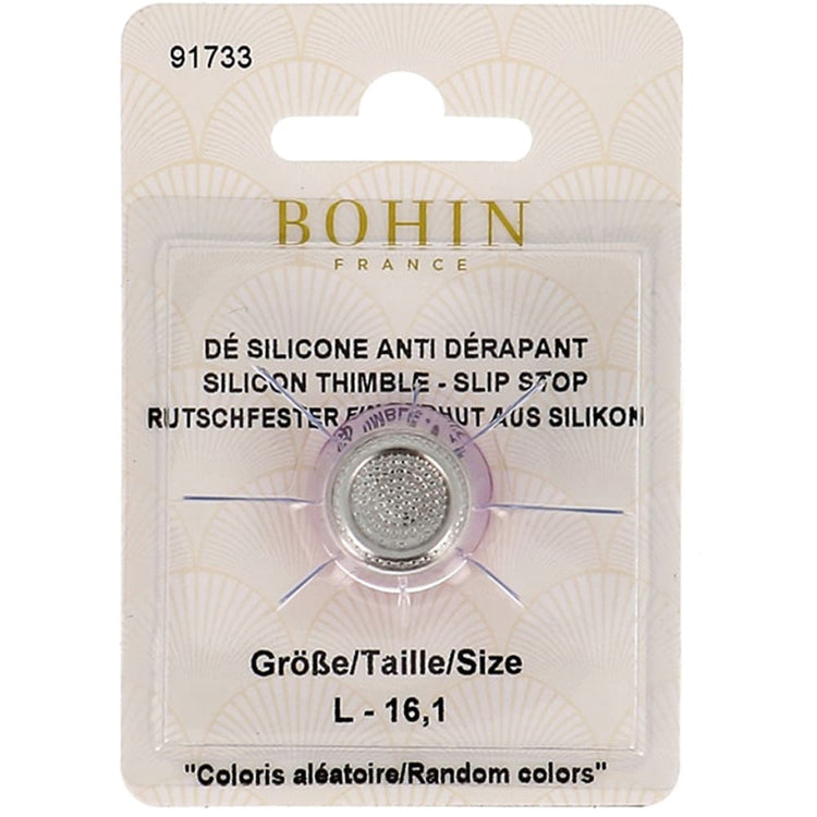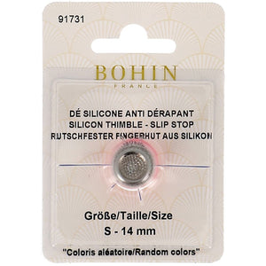 Protect your fingers when sewing with Bohin's Silicone Thimble with Slip Stop tops. The top of this thimble has a brass nickel plated head to prevent finger pricks. Choose from four sizes: small, medium, large, or extra-large. Colors may vary.