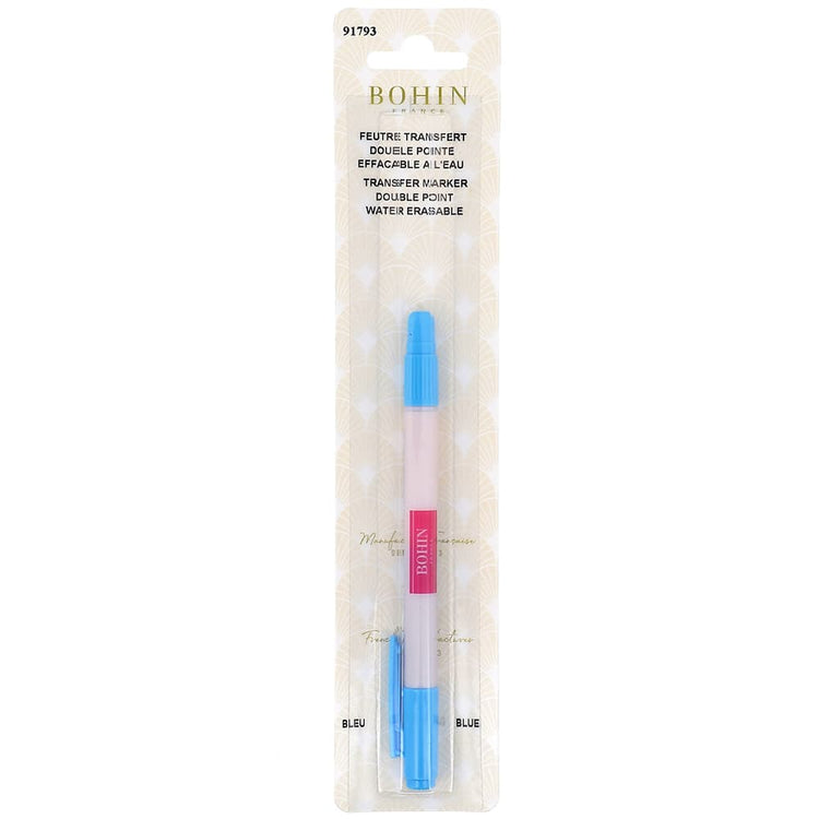 Bohin's Water Soluble Transfer Pen is perfect for marking out patterns and designs before construction. It works with any transfer paper and is safe to use on fabric, needle-art, candlewicking, embroidery, and more!. The bright blue line it leaves behind is easy to see after transfer. Plain water will remove the marks quickly.