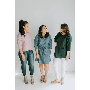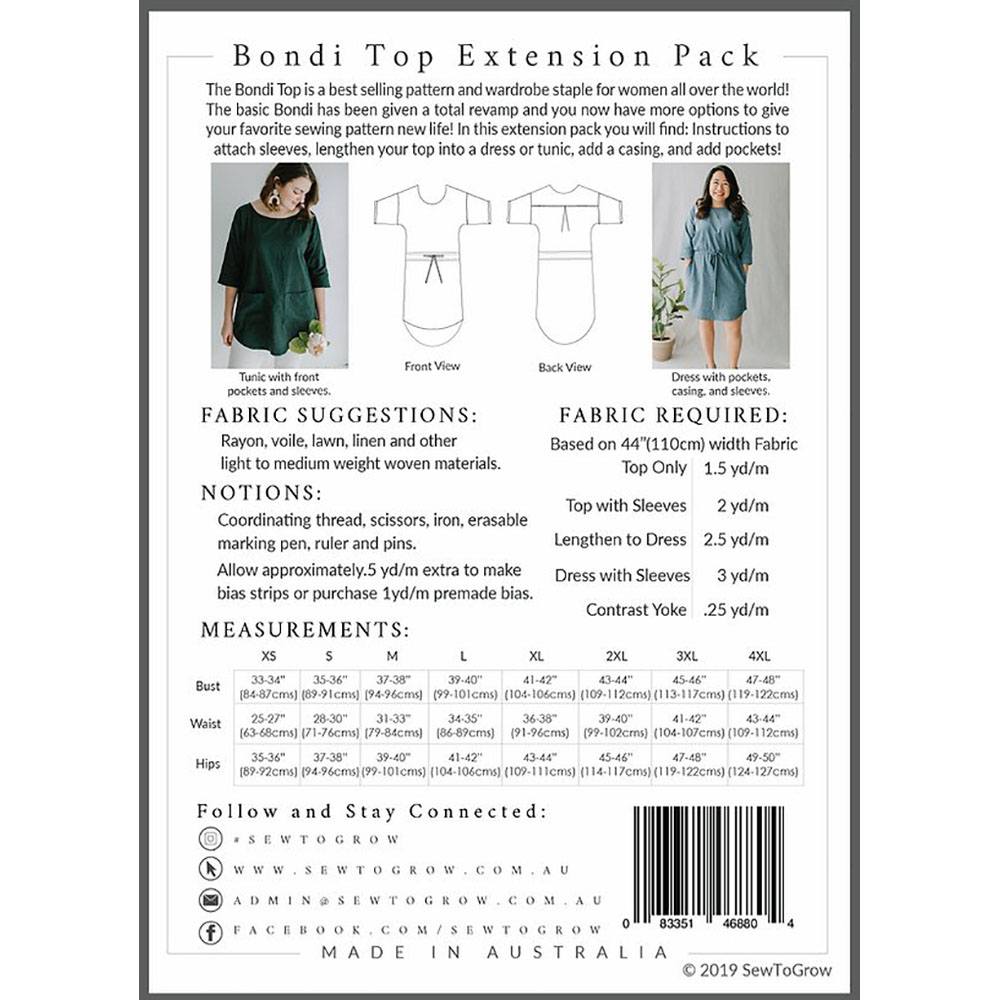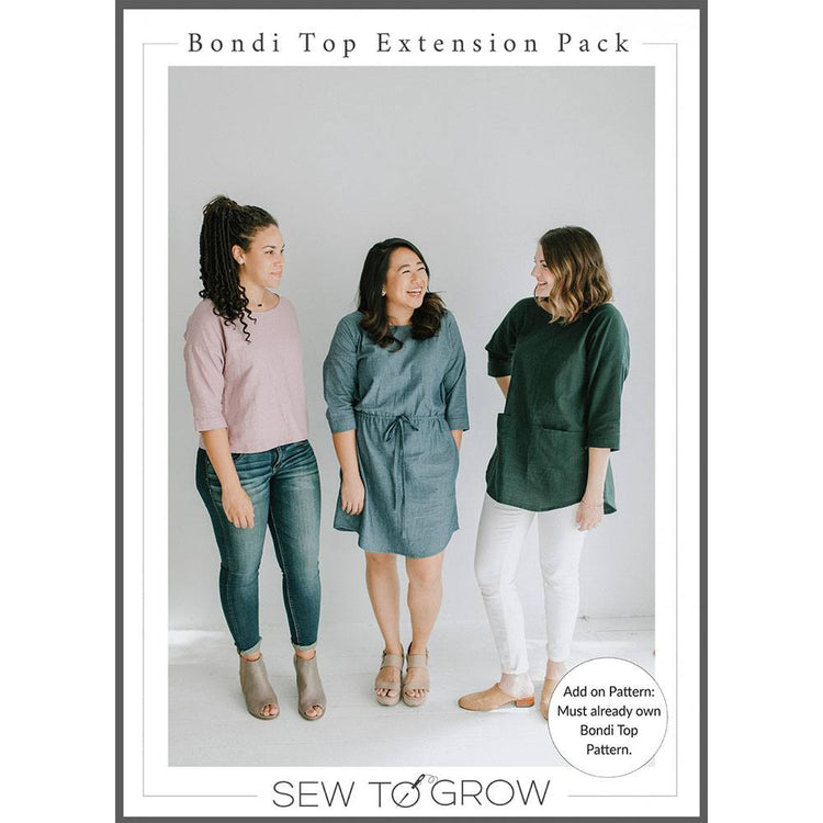 The Bondi Top is one of Sew to Grow's most iconic patterns. Now you can do even more with the Bondi Top Extension Pack! The basic design of the Bondi has been updated with exciting new options to customize a classic. The Bondi Top Extension Pack includes instructions to add a casing, lengthen the top into a tunic or dress, attach sleeves, or add pockets! Please note that for this pattern to work you must already own the original Bondi Top Pattern.