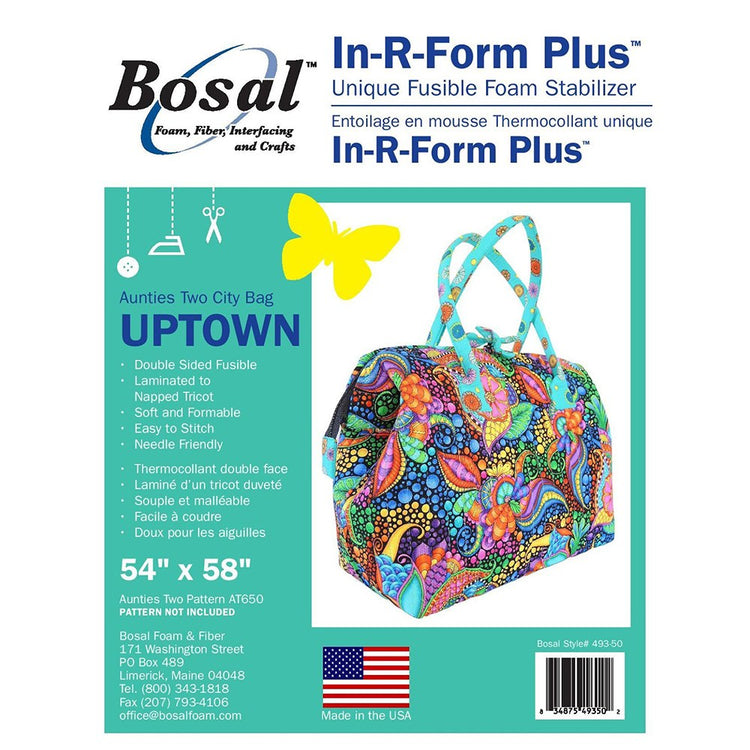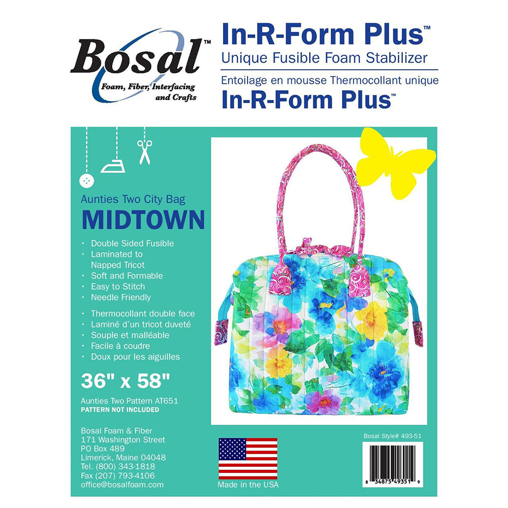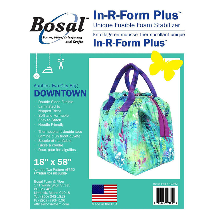 Use Bosal's In-R-Form Plus Double-Sided Fusible Uptown Stabilizer with Auntie's Two City Bag Patterns (not included). Choose from three sizes to best complete your project, 54"x58", 36"x58", or 18"x58". This unique foam stabilizer is made with In-R-Form, laminated to naped tricot, and fusible on both sides. Ideally, this stabilizer is meant to be used with the City Bag Patterns, but they can be used on any purse pattern. Made in the USA.